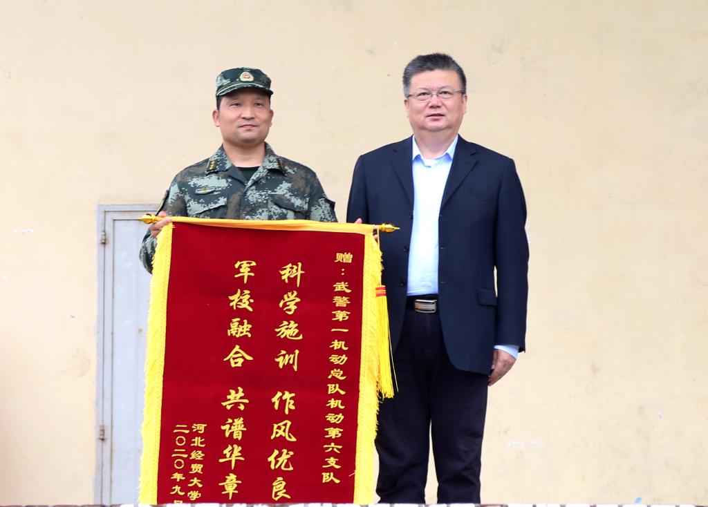 最后,在全场热烈掌声中,刘兵代表学校为承训部队赠送锦旗,向全体帮训官兵对我校2020级大学生军训工作的大力支持和辛勤付出表示感谢。