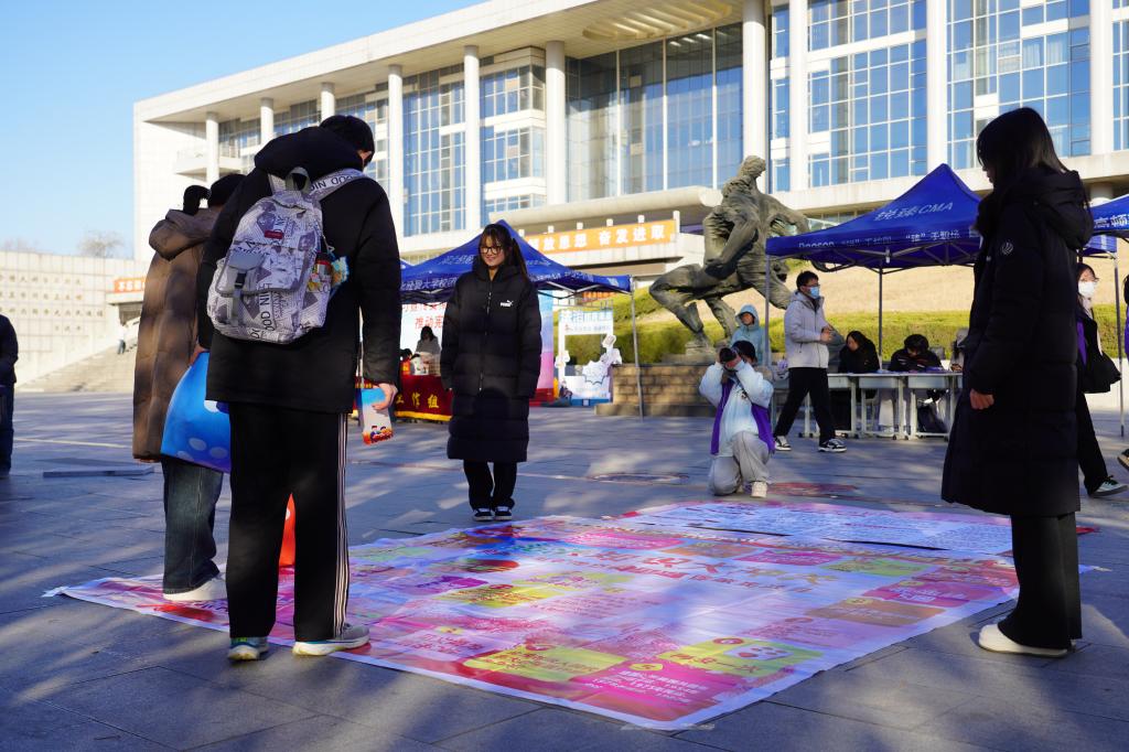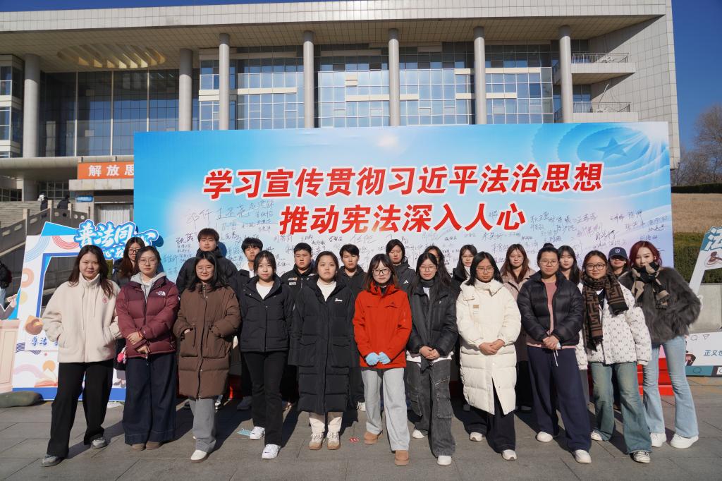 图书馆广场前,形式多样的互动活动让宪法学习“活”起来。宪法宣传签名墙前,师生们纷纷驻足打卡、郑重落笔、合影留念,以质朴而真诚的方式用心传递对宪法的认同与坚守;宪法知识展板系统解读了宪法日由来、公民基本权利、宪法最高效力等核心内容,让师生在沉浸式学习中深化对宪法历史与内涵的理解;宪法知识大冲关飞行棋游戏趣味十足,吸引众多同学踊跃参与,大家在轻松愉悦的互动氛围中学习宪法知识,有效提升了宪法知识知晓率与法治素养;普法志愿者还通过悬挂条幅、张贴海报、发放知识手册等形式开展宪法宣传活动。